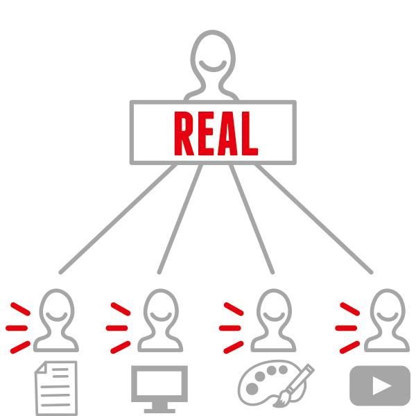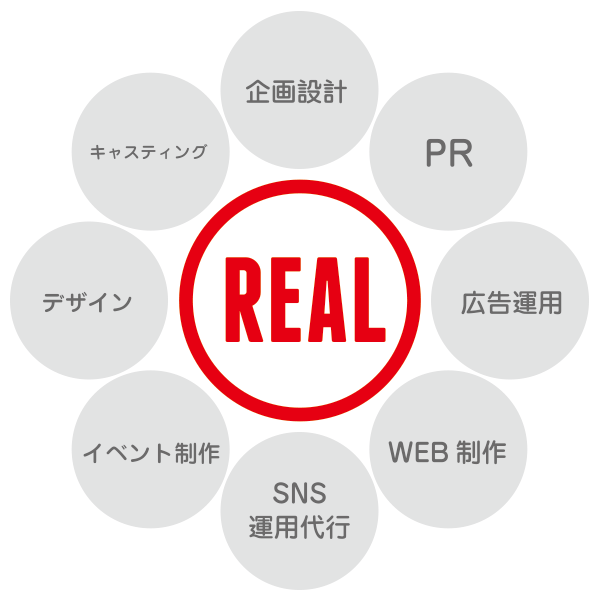 - REALは様々な制作を⼀括してプロデュースをする事で、今までの広告業界には無いまったく新しい価値をご提供します。