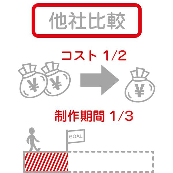 - 実績から他社と⽐較した場合、コストは他社の約2分の1以下となり制作期間は他社の約3分の1程で⾏う事ができます。